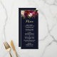 Cartão de cardápio de casamento do estilo boêmico com ilustração aquosa de peões e rosas com sotaque de burgundy, vermelha e rosa com penas. Itens correspondentes também estão disponíveis. Clique no botão "Personalizar" para alterar fontes, tamanhos e cores.
