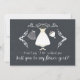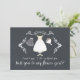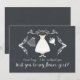 Cartão contemporâneo de "Você será minha menina das flores" com vestido de noiva, véu, flores e sapatos com uma linda fonte manuscrita em um fundo moderno de quadro de giz preto.