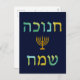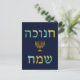 o חנוכהשמח, hebraico para Hanukkah feliz, é ilustrado no azul, no ouro e na tipografia verde da aguarela com um menorah de Hanukkah do ouro em um fundo azul profundo.