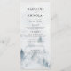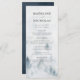 Cartão de cardápio personalizado elegante com uma floresta de cinzas e pinheiros azuis e azuis com cor d'água no topo com seu nome, data do casamento e detalhes do menu mostrados abaixo. O menu reverte para um fundo de cor d'água azul marinho com espaço para texto e fotos. Projetado para coordenar com a nossa coleção de casamento Elegante da Floresta de inverno.