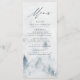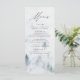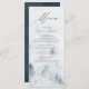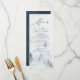 Cartão de menu personalizado elegante que apresenta os detalhes do menu no topo do menu com uma floresta de cinzas e pinheiros azuis-negras azuis no fundo. O menu reverte para um fundo de cor d'água azul marinho com espaço para texto e fotos. Projetado para coordenar com a nossa coleção de casamento Elegante da Floresta de inverno.