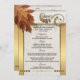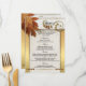 Um cartão de cardápio de chique com folhas coloridas de outono num painel de madeira branco-rusticado, emoldurado por um revestimento de ouro e espirais metálicas festivas. Um cartão bonito e elegante para uma mesa de janto no outono.
