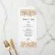 Design de folha de rendas de ouro antiga e elegante cria esta placa de menu exclusiva de recepção de casamento de boho vintage. Personalizável com nomes de noiva e noivo e cursos e opções de janto. Convite de correspondência, rsvp, banda de barriga, adesivos, obrigado de etiquetas e muito mais disponível.
