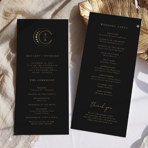 Transforme a sua experiência de jantar com o "Cartão de Menu de Casamento de Lua Dourada", colocado contra um pano de fundo preto rico. Os elementos celestes do ouro, acompanhados pelas iniciais elegantemente simples e personalizáveis, trazem um toque de magia às suas configurações de mesa. As fases da lua delicadamente integradas na design elevam a experiência de jantar, simbolizando os variados cursos de sua celebração celestial.
