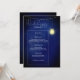 Menus correspondentes para o tema de casamento azul meia-noite, com recurso de pote de pedra e luzes de corda e tipografia branca definida de um lado para um visual muito elegante.