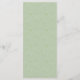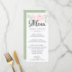 O design de menu elegante apresenta rosas cor-de-rosa-pinceladas em verde moderno. Menu é escrito em uma bela fonte grande de script. Há espaço para você listar e descrever quatro cursos. Pode adicionar facilmente as suas informações e ajustar a posição. A parte de trás do cartão de menu é verde sábio com um padrão de folha muito sutil.