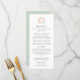 O nosso cardápio de casamento Zen apresenta os seus cursos iniciais, entretenimentos e sobremesas na elegante inscrição de cinzas de carvão, destacada com uma ilustração de um par de peixes koi e folhas aquáticas em laranja-coral e verde-primavera. Coordenadas com nossa elegante coleção de convites de casamento de Koi Pond. Use os campos modelo para adicionar as informações do menu e clique em "Personalizar" para reposicionar os elementos, se necessário. Precisa de ajuda? Entre em contato comigo através do link "Perguntar a este Designer" nesta página.