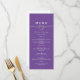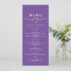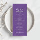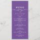 Adicione um toque de na moda às suas mesas de recepção com este moderno cartão de cardápio de casamento roxo. Apresentando um fundo violeta profundo, coração romântico de corda prateada e um roteiro elegante de caligrafia, esta design destaca lindamente suas seleções de refeições de casamento enquanto complementa seu sofisticado tema de casamento.