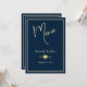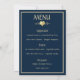 Um cartão de menu de casamento clássico em azul-marinho e dourado, projetado com texto em cor dourada, bordas e um acento em forma de coração, sobre um fundo azul-marinho escuro. Para personalizar este cartão elegante, basta inserir o nome do noivo e da noiva, a data do casamento e as opções do menu de casamento no nosso modelo fácil, substituindo o texto de exemplo. Certifique-se de ver os acessórios de recepção correspondentes, incluindo: o cartão de mesa de casamento, cartão de lugar, livro de visitas de casamento e banner.