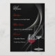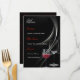 Um cartão de cardápio de casamento moderno e elegante com um fundo preto elegante com óculos de vinho tinto. Este design de na moda é uma maneira perfeita de mostrar o seu menu para uma recepção jante sofisticada.