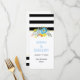 Cartão de cardápio moderno e na moda que apresenta flores folclóricas bonito em azul-aqua e amarelo, uma banda branca com contorno de ouro e um padrão listrado preto-e-branco.