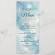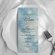 Adicione um toque mágico às suas mesas de recepção com este menu de casamento no inverno congelado em azul empoeirado. Com elegantes flocos de neve com aquarela, um coração romântico de corda prateada, e uma tipografia refinada com script, esta carta apresenta lindamente suas seleções de refeições. Perfeito para casamentos no inverno formais, recepções de férias ou eventos de neves.