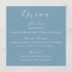 Adicione um toque fresco e elegante às suas mesas de recepção com este cartão de cardápio azul empoeirado. Apresentando tipografia romântica e tons sazonais suaves, esta design é perfeita para casamentos de primavera e comemorações de jardim. Personalize com seus próprios detalhes de refeições para criar um lugar bonito e coeso.