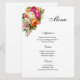 O cartão de menu é mostrado com uma linda impressão de mistura floral de cores vivas, mostrado no papel cartão matte branco da assinatura. Texto em script e padrão em cor preta. Personalize os itens do menu e altere os itens de amostra para os seus com este modelo. Impressão Licenciada