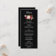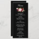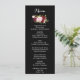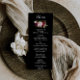 Este clássico cartão de janto preto tropical preto é perfeito para um casamento rústico. O design de marsala artístico bordo apresenta rosas de aquarela, verdes, cor-de-rosa, burgundy e blush, combinados com verde, bem arrumados num buquê de flores gracioso e radiante. Este menu pode ser usado para recepção de casamento, janto de ensaio, chá de panela ou qualquer evento.