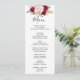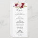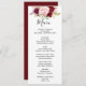 Este cartão vermelho tropical e romântico de janto é perfeito para um casamento rústico. O design de marsala artístico bordo apresenta rosas de aquarela, verdes, cor-de-rosa, burgundy e blush, combinados com verde, bem arrumados num buquê de flores gracioso e radiante. Este menu pode ser usado para recepção de casamento, janto de ensaio, chá de panela ou qualquer evento.