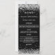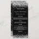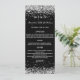 Um cardápio elegante e glamouroso. Personalize e adicione seu nome, data e menu. Fundo preto, decorado com falso confete prateado.