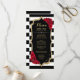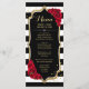 Cartão de Menu. Design preto e branco sofisticado com dourado brilhante falso. Listras pretas e brancas com rosas vermelhas. Perfeito para uma festa elegante.