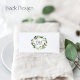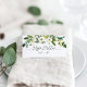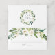 Cartão floral branco e verde-chico ou design de cartão de mesa apresenta uma borda superior de verde-aquarela e flores brancas. Espaço fornecido para nome de convidado e número da tabela. Cartões inversos para revelar um quadro floral correspondente com suas iniciais e dentro de data de casamento. Projetado para combinar com nosso casamento e a coleção de eventos de Alabastro.