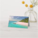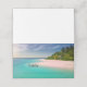 A table place card with a beautiful photograph. A scenic tropical beach with aquamarine water and a white sandy beach with a lush forest in the back.