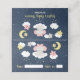 Este cartão de lugar giro e caprichoso apresenta um adorável elefante bebê em um arco rosa sentado em uma nuvem com estrelas caindo. Ao fundo está um céu noturno estrelado e lua crescente. O texto combina o script manuscrito e as fontes sans serif para uma aparência estilosa e moderna. Isto é perfeito para um chá de fraldas.