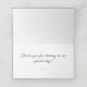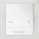 O design frontal apresenta um fundo branco para o número da tabela que é exibido no topo à esquerda em uma fonte elegante e prateada. O centro exibe uma linha fina e cor de prata para o nome do convidado. Um florescimento delicado é ilustrado de ambos os lados. Uma cruz de cor prateada é exibida no canto superior direito. Os primeiros nomes do casal são exibidos abaixo em um impressão nítido. Dentro design consiste na sua mensagem de gratidão sobre um delicado florescimento. O fundo é branco. Também disponível em cor-de-champanhe e em coordenadas com a "Suíte de Casamento Simplesmente Católica".