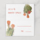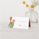 Cartões de lugar de casamento com cacto aquarela com flores laranja vermelhas. O texto e as linhas para nome e número da mesa e o interior também são laranja vermelhos.