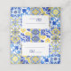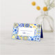 Este design rústico apresenta um padrão de fundo de azulejos portugueses, azulejos, de cor aquática azul, amarela e branca. Os espaços para os números de tabelas e os nomes dos convidados são fornecidos por linhas azuis num fundo retangular branco, com a palavra "Mesa" em escrita de caligrafia azul. O dentro das placas é azul estável.