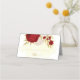 Flores vermelhas escuras e brancas românticas com folhas de ouro cartão de lugar de casamento botânico. Os detalhes de brilho são simulados.