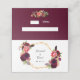 Decorados com flores boêmicas de cor aquosa, ao estilo do bolho, rosas em burgundy e rosa. Um fundo branco elegante e cheio de lama. Modelos para nome e data de casamento. Os nomes são escritos com uma escrita estilo moderna e elegante, escrita à mão. Letras pretas coloridas. Com uma falsa estrutura geométrica dourada. Voltar: espaço para você escrever manualmente o nome dos seus convidados e número da mesa. Dentro de fundo burgundy: cor burgundy.