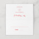 Um moderno e elegante. Personalize e seus nomes e a data do casamento. Adicione seus nomes de convidados e seu número de tabela manualmente. Fundo branco, texto vermelho.