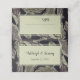 Um dos lados dessa elegante design moderna mostra os nomes da noiva e do noivo e a data do casamento em preto e texto serif em um fundo retangular verde, bordado por um padrão foliar tropical exuberante em verde em preto. O outro lado, com uma borda de folhagem tropical correspondente, fornece um espaço retangular verde para escrevendo os nomes de convidados de casamento e seus números de tabela.