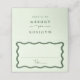 Adicione um toque de na moda à sua recepção de casamento ou evento especial com os cartões de casamento do Modern Wavy Frame! O design retrovisor exibe "Mesa" em um script verde manuscrito com espaço para você escrever o nome do convidado e o número da tabela. Uma borda ondulada verde escura rodeia a design contrastando com um fundo verde-claro. A parte de trás do cartão de lugar dobrado apresenta os seus nomes e a data do casamento em letras verdes em negrito.