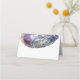 Este cartão de lugar colorido do abalone, cor d'água, é perfeito para a sua mesa de casamento de praia quica costeira. Lindas ilustrações de cor d'água do abalone roxo, azul e rosa, em conjunto com fontes modernas, mínimas e elegantes perfeitas para o seu casamento de destino no Pacífico. Coleção correspondente disponível. Trabalho de arte por Material Selecionado.