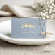 Cartão romântico de núpcias, com duas folhas de ouro... e pomares em fundo azul empoeirado. A fonte de script elegante para nomes e datas adiciona um toque suave e pessoal. Perfeito para atribuir lugares de recepção com estilo e charme. Coordena-se com a suíte de casamento Dusty Blue e Dourada Lovebird para um evento coeso. Facilmente personalizável com nomes de convidado para um monitor de assentos polido.