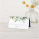 A placa botânica chic ou a design de placa de mesa apresenta uma borda superior de folhagem verde de cor aquosa de eucalipto. Espaço fornecido para nome de convidado e número da tabela. Cartões inversos para revelar uma coroa botânica correspondente com suas iniciais e dentro de data de casamento. Projetado para combinar nosso casamento e coleção de eventos Eucalyptus Grove.
