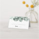 Este cartão de casamento floral verde tropical é perfeito para um casamento rústico. A design apresenta palmeiras verdes folhas buquês com flores brancas adoráveis. Personalize a parte de trás do cartão de lugar com os nomes da noiva e do noivo e a data.