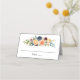 Cartões de lugar com escolta dobrados apresentam um arranjo floral de cor d'água em tons de pêssego, ouro amarelo, azul e burgundy com sotaques verdes.