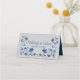 Este romântico cartão floral de cinza azul e prateada tem uma imagem de um par de corações unidos sobre uma fita azul real e uma imagem arco que atravessa a largura da frente do cartão local. Há uma borda prateada simulada abaixo da fita e um texto azul real sobre um fundo de cinza. Os nomes da noiva e do noivo, juntamente com a data do casamento, são impressos no verso do cartão de lugar dobrado em azul real com flores azuis em volta do texto.