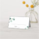 Cartão de lugar de casamento elegante com um simples design com aquarela pintada de eucalipto verde no canto superior esquerdo e canto inferior direito. Abaixo estão linhas para escrevendo os nomes dos seus convidados e o número da tabela. A parte de trás tem os seus nomes e a data do casamento sobre uma sombra de verde médio. Estas cartas de casamento botânico, com uma reviravolta moderna, são perfeitas para um casamento de primavera ou verão.