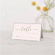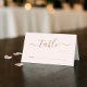 Chic light pink wedding table number place cards featuring "table" in a stylish gold script with swashes and blank lines for you to fill in the table numbers and guests' names. On the back, add your first names joined by a heart and your reception date in simple gold lettering.