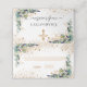 Personalize e adicione um nome. Um fundo branco, decorado com verde de eucalipto, farelos de brilho dourado e uma cruz de ouro. Com a palavra de confirmação escrita com um moderno estilo escrito à mão.