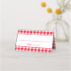Personalize a cor na frente e atrás do gráfico de padrão gingham de azulejo perfeito para corresponder à paleta de casamento. Você também pode alterar a cor da borda e as linhas na etiqueta na frente dessas placas de lugar. Uma fonte moderna simples é usada, mas a cor e o estilo também podem ser personalizados. Cartões de gingham ruidosos vermelhos e brancos para um casamento no celeiro.