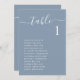 Cartão de assento de mesa azul-chic empoeirado, com "mesa" em um roteiro branco-na moda, com hastes, o número da tabela em uma tipografia elegante de serifa branca e o nome de seus convidados em uma tipografia simples e branca moderna. Crie cada gráfico de assentos de mesa individualmente e adicione ao seu carrinho de compro um de cada vez e, em seguida, faça o check-out assim que todas as mesas estiverem no carrinho.