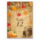 Cartão de mesa de casamento russo para um casamento no oeste do país com luzes de cordas, folhas de queda, abóboras, botas de vaqueiro e um barril sobre um fundo de madeira.