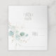 Arranjos elegantes e inspirados na natureza, incluindo goma azul eucalipto com esboços de folhas de ouro e ouro junto com layouts únicos de design, fazem disso um maravilhoso jogo de casamento para qualquer época do ano. O cartão de lugar de mesa de coordenação mostrado aqui apresenta uma borda de canto de folhagem exuberante na frente, seus nomes e data de casamento na parte de trás e uma textura macia e aquosa para o interior. Veja o link de coleção nesta página para ver todos os itens correspondentes neste belo design ou ID817 de pesquisa para ver outras peças e opções de cor para este conjunto.