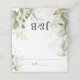 Cartões de casamento em verde botânico com fundo branco na moda, folhagem verde-aquática elegante, sotaques com brilho dourado, suas iniciais, data de casamento e uma linha para adicionar nomes de convidados e o número da tabela.