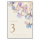 Estas mesas elegantes são perfeitas para casamentos de primavera e verão. Este design apresenta íris de aquarela em tons de lilás e de azul-piscadela. Toques sutis de ouro acrescentam um elemento mágico e brilhante.