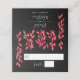 Folhas elegantes pintadas em tons de rosa quente a vermelho e laranja com espaço previsto para o nome do convidado e número da tabela. O design da vinha segue de frente para trás em um fundo preto. CORRESPONDENDO a itens na nossa loja.