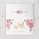 Cartão de lugar com tema de borboleta feminina apresentando uma ilustração linda de flores rosa e vermelho vivo em aquarela e um par de borboletas douradas intrincadas